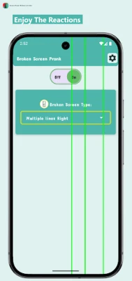 Introducing "Screen prank, glitching green lines" - the app that puts you in control of the most hilarious screen pranks. Our application is a fun, simulated app that mimics a broken screen effect to prank your friends and family. It displays realistic broken screen graphics, but rest assured, it won't harm your phone.